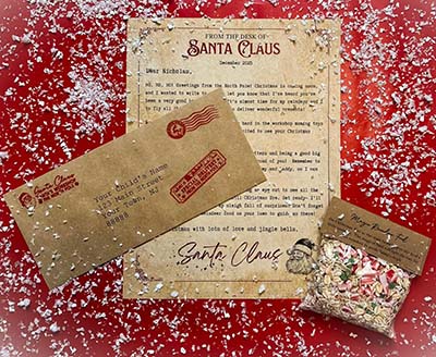 Each magical letter from Saint Nick himself comes with a magic Reindeer Feed Pouch, perfect for sprinkling on your lawn to guide